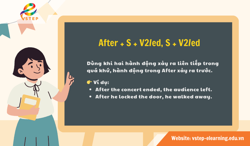 Đây là cấu trúc được sử dụng khi một hành động đã hoàn thành trước hoàn toàn trong quá khứ, sau đó một hành động khác mới xảy ra. Cấu trúc này giúp nhấn mạnh rằng hành động trong mệnh đề After xảy ra trước hành động trong mệnh đề chính. Vì vậy, động từ trong mệnh đề After thường được chia ở thì quá khứ hoàn thành.